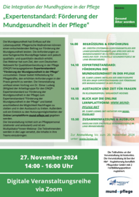 Im Zentrum des Online-Seminars stand der Expertenstandard “Förderung der Mundgesundheit in der Pflege” herausgegeben vom Deutschen Netzwerk für Qualitätsentwicklung in der Pflege (DNQP). Die Mundgesundheit hat Einfluss auf die allgemeine Gesundheit und damit auch auf die Lebensqualität von allen Menschen. Besonders pflegebedürftige Menschen sind oft auf Unterstützung angewiesen, um ihre Mundgesundheit aufrechtzuerhalten. Der Standard bietet Pflegefachkräften praxisnahe Empfehlungen, um die Mundpflege gezielt zu fördern, Probleme frühzeitig zu erkennen und bei Bedarf weitere Berufsgruppen hinzuzuziehen. Dabei wird besonderer Wert auf die interdisziplinäre Zusammenarbeit und die Einbindung der Pflege in den gesamten Versorgungsprozess gelegt. Es geht darum, die Mundgesundheit zu erhalten und bestehende Beeinträchtigungen gezielt zu verbessern.